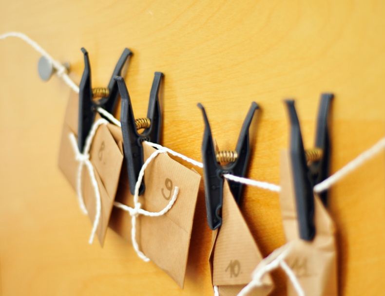 UND SO GEHT’S: Schreiben Sie auf kleine Kärtchen Ihre Weihnachtsgrüße und packen Sie sie in Papier ein. Natürlich können Sie auch abwechselnd kleine Süßigkeiten dazu stecken. Für den DIY Adventskalender verschnüren Sie die kleinen Päckchen mit der Schnur oder dem Geschenkband. Schreiben Sie die Zahlen von 1 bis 24 darauf. Mit den Wäscheklammern können Sie sie nun an einem deutlich längeren Stück Band befestigen. Fertig ist Ihr selbst gebastelter Adventskalender – Sie müssen ihn nur noch aufhängen.
