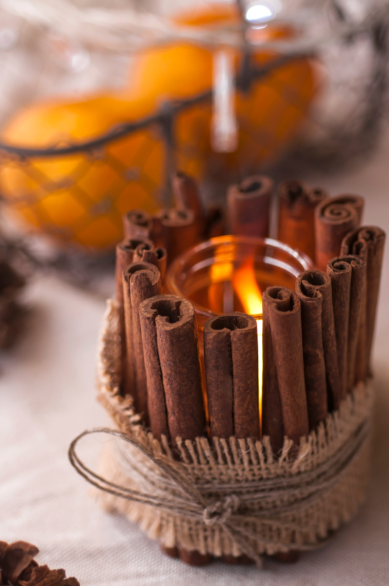 WAS SIE BRAUCHEN: kleines Glas, Teelicht, Zimtstangen, Packband, breites Geschenkband, ggf. Kraftkleber.