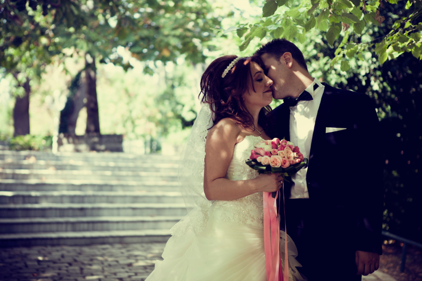 Obwohl der Fokus auf dem Brautpaar liegt, sollten Sie sich Gedanken über den Hintergrund für das Hochzeitsfoto machen. Immerhin stellt er den richtigen Rahmen dar. Typisch ist bei Portraitfotos, den Hintergrund durch Unschärfe mehr oder weniger auszublenden. Sie haben mehrere Möglichkeiten, um diesen Effekt zu erreichen. Einerseits können Sie mit einer kleinen Blendenzahl (= große Blende) fotografieren, sodass die Schärfe auf das fotografierte Motiv gelegt wird – an den Rändern wird das Foto unscharf und der Hintergrund verschwimmt. Einen ähnlichen Effekt hat es, wenn Sie mit einem Objektiv mit großer Brennweite fotografieren (z. B. 70 – 200 mm). Außerdem sollte der Hintergrund vom Brautpaar möglichst weit weg sein.