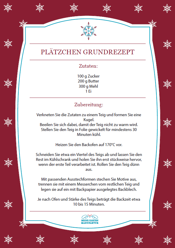 Wenn Sie schnelle Plätzchen Rezepte zu Weihnachten suchen, sollten Sie das Grundrezept für Butterplätzchen immer im Kopf haben. Auf Wunsch können Sie sich auch unsere Rezeptkarte mit dem Grundrezept ausdrucken, in der Küche aufhängen und je nach Gusto abändern und mit unterschiedlichen Zutaten wie Schokolade, Nüsse oder Gewürzen experimentieren.