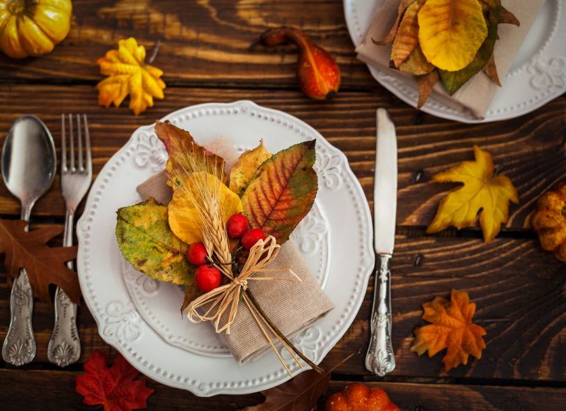 Für eine herbstliche Tafel brauchen Sie nicht viel: etwas Herbstlaub in leuchtenden Farben, ein paar Korn-Ähren und einige gesammelte Hagebutten oder Kastanien machen die Tischdeko für den Herbst perfekt.