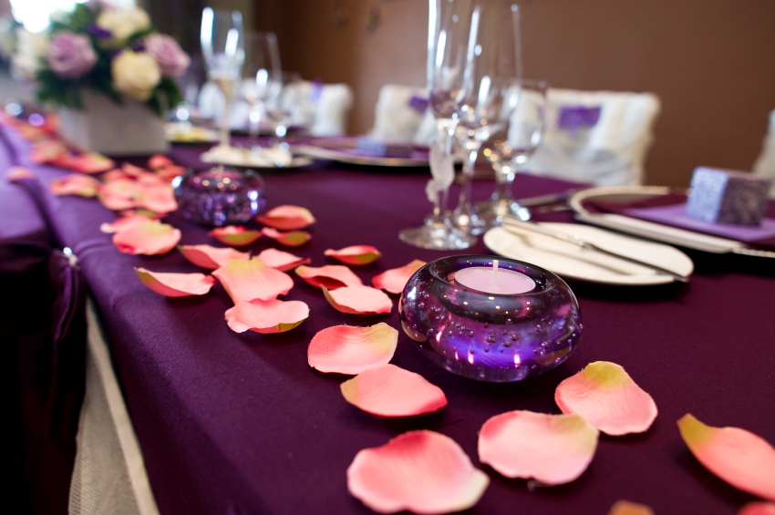 Romantisch zur Hochzeit: Tischdeko mit Rosenblättern. Die Königin der Blumen macht nicht nur langstielig und mit großen Blüten eine gute Figur, auch die zarten Blätter sehen als Tischdeko wunderschön aus.