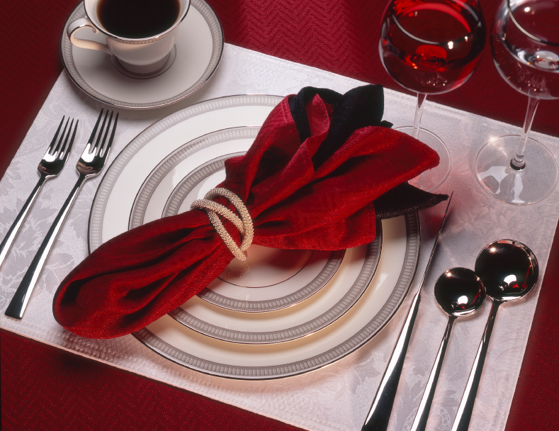 WAS HIERBEI WICHTIG IST: Wenn Sie ihren Tisch in einer starken Farbe eindecken wollen, achten Sie darauf, dass die Farbe nur in einigen Akzent-Teilen auftaucht: als dekorativer Unterteller, als Farbe der Gläser, oder so wie hier als Serviette. Der Rest sollte dann schlicht in Weiß (ggf. in Kombination mit Schwarz, Grau, Silber oder Gold) gehalten werden. Wenn Sie zwei separate Highlights setzen wollen (wie hier Tischläufer und Serviette), achten Sie darauf, dass die Töne sich nicht beißen. Gerade bei Rot müssen Sie vorsichtig sein.